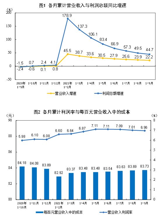 1—9月份,全国规模以上工业企业实现利润总额63440.8亿元,同比增长44.7%(按可比口径计算,详见附注二),比2019年1—9月份增长41.2%,两年平均增长18.8%。