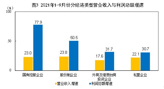 1—9月份,规模以上工业企业中,国有控股企业实现利润总额19850.5亿元,同比增长77.9%;股份制企业实现利润总额45209.0亿元,增长50.5%;外商及港澳台商投资企业实现利润总额16978.0亿元,增长31.7%;私营企业实现利润总额18606.3亿元,增长30.7%。