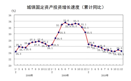 3.投资保持较快增长,投资结构继续改善。全年全社会固定资产投资278140亿元,比上年增长23.8%,增速比上年回落6.2个百分点,扣除价格因素,实际增长19.5%。其中,城镇固定资产投资241415亿元,增长24.5%,回落5.9个百分点;农村固定资产投资36725亿元,增长19.7%,回落7.6个百分点。在城镇投资中,第一产业投资增长18.2%,第二产业投资增长23.2%,第三产业投资增长25.6%。分地区看,东部地区投资增长22.8%,中部地区增长26.9%,西部地区增长26.2%。全年房地产开发投资48267亿元,增长33.2%。
