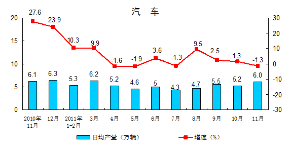 分产品看,11月份,468种产品中有339种产品同比增长。其中,发电量3713亿千瓦时,日平均发电量124亿千瓦时,增长8.5%;钢材7010万吨,日平均产量234万吨,增长7.8%;水泥18806万吨,日平均产量627万吨,增长11.2%;原油加工量3787万吨,日平均产量126万吨,增长3.2%;十种有色金属284万吨,日平均产量9.5万吨,增长8.2%;乙烯132万吨,日平均产量4.4万吨,增长1.9%;汽车179.3万辆,日平均产量6.0万辆,下降1.3%;轿车98.3万辆,日平均产量3.3万辆,下降0.8%。