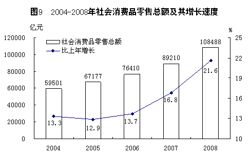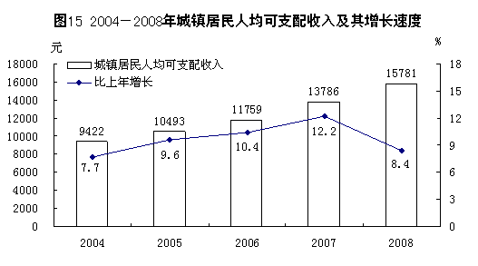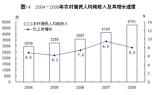 全年农村居民人均纯收入4761元,扣除价格上涨因素,比上年实际增长8.0%;城镇居民人均可支配收入15781元,实际增长8.4%。农村居民家庭食品消费支出占家庭消费总支出的比重为43.7%,城镇居民家庭为37.9%。按2008年农村贫困标准1196元测算,年末农村贫困人口为4007万人。