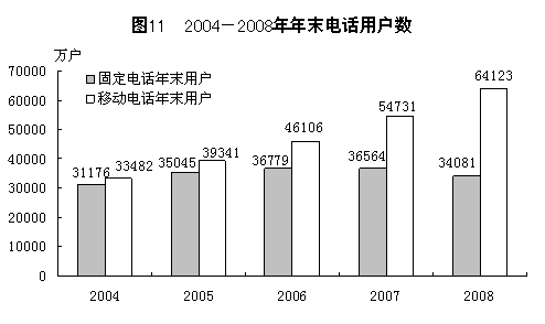 全年完成邮电业务总量23841亿元,比上年增长20.7%。其中,邮政业务总量1402亿元,增长15.5%;电信业务总量22440亿元,增长21.0%。全年减少局用交换机156万门,总容量5.1亿门。固定电话年末用户34081万户。其中,城市电话用户23200万户,农村电话用户10881万户。新增移动电话用户9392万户,年末达到64123万户。年末全国固定及移动电话用户总数达到98204万户,比上年末增加6909万户。电话普及率达到74.3部/百人。互联网上网人数3.0亿人,其中宽带上网人数2.7亿人。
