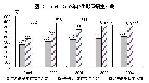 全年研究生教育招生44.6万人,在学研究生128.3万人,毕业生34.5万人。普通高等教育招生607.7万人,在校生2021.0万人,毕业生512.0万人。各类中等职业教育招生810.0万人,在校生2056.3万人,毕业生570.6万人。全国普通高中招生837.0万人,在校生2476.3万人,毕业生836.1万人。全国初中招生1856.2万人,在校生5574.2万人,毕业生1862.9万人。普通小学招生1695.7万人,在校生10331.5万人,毕业生1865.0万人。特殊教育招生6.2万人,在校生41.7万人。幼儿园在园幼儿2475.0万人。