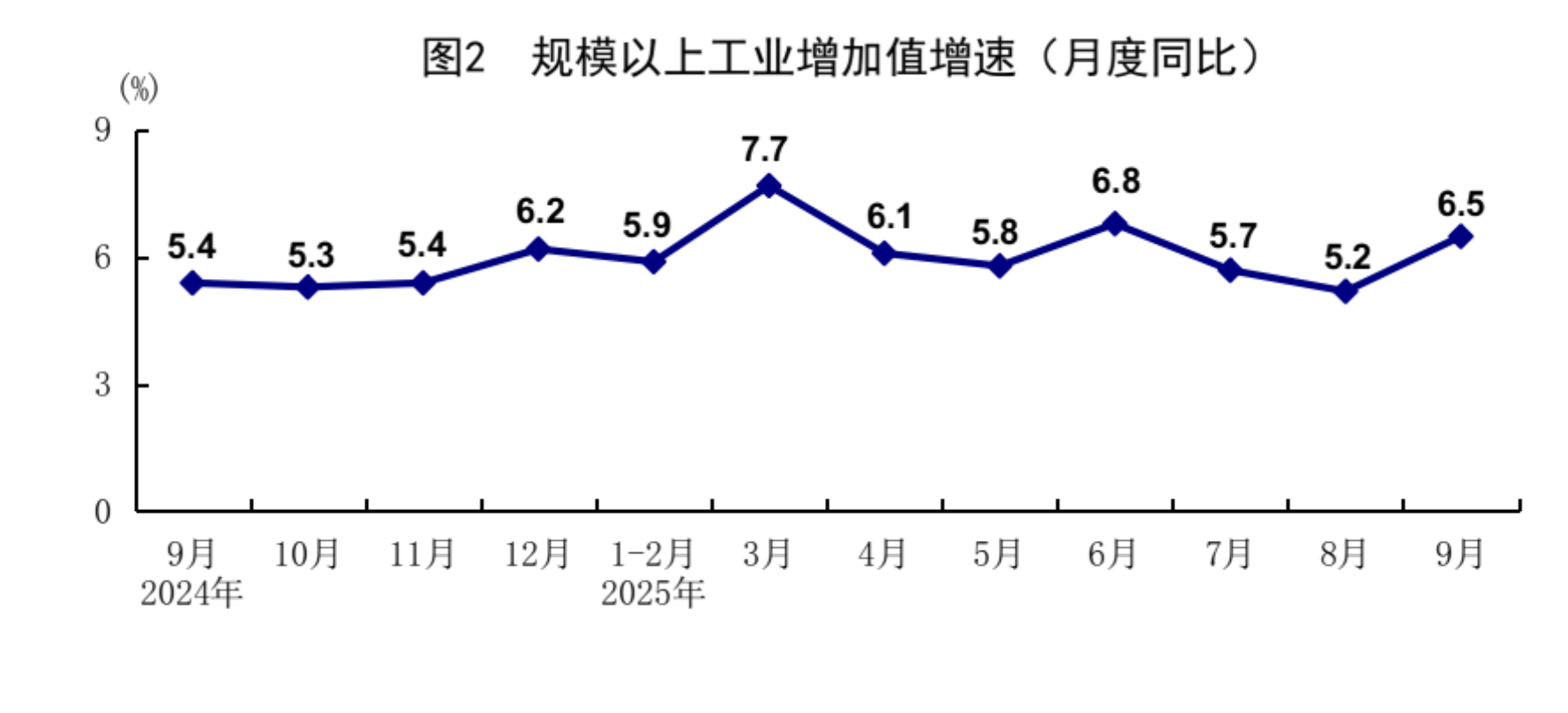前三季度,全国规模以上工业增加值同比增长6.2%。分三大门类看,采矿业增加值同比增长5.8%,制造业增长6.8%,电力、热力、燃气及水生产和供应业增长2.0%。装备制造业增加值同比增长9.7%,高技术制造业增加值增长9.6%,增速分别快于全部规模以上工业3.5和3.4个百分点。分经济类型看,国有控股企业增加值同比增长4.6%;股份制企业增长6.7%,外商及港澳台投资企业增长4.1%;私营企业增长6.1%。分产品看,3D打印设备、工业机器人、新能源汽车产品产量同比分别增长40.5%、29.8%、29.7%。9月份,规模以上工业增加值同比增长6.5%,环比增长0.64%。9月份,制造业采购经理指数为49.8%,比上月上升0.4个百分点;企业生产经营活动预期指数为54.1%,上升0.4个百分点。1-8月份,全国规模以上工业企业实现利润总额46930亿元,同比增长0.9%。
