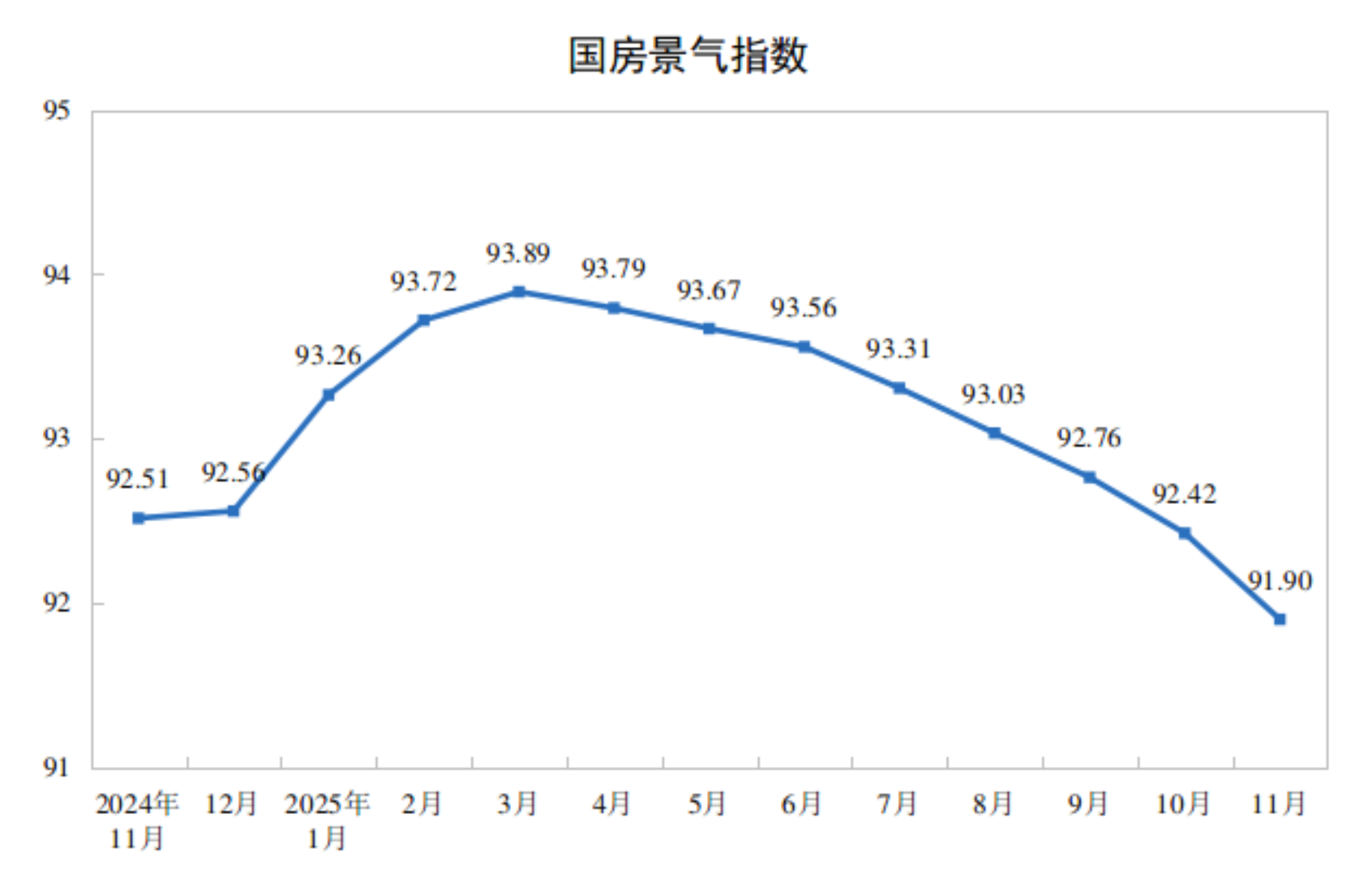 11月份,房地产开发景气指数(简称“国房景气指数”)为91.90