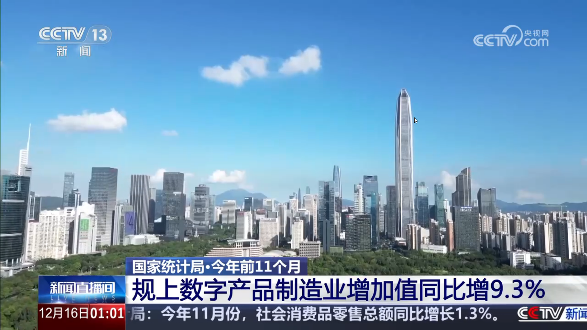 《新闻直播间》国家统计局 今年前11个月 规上数字产品制造业增加值同比增9.3%