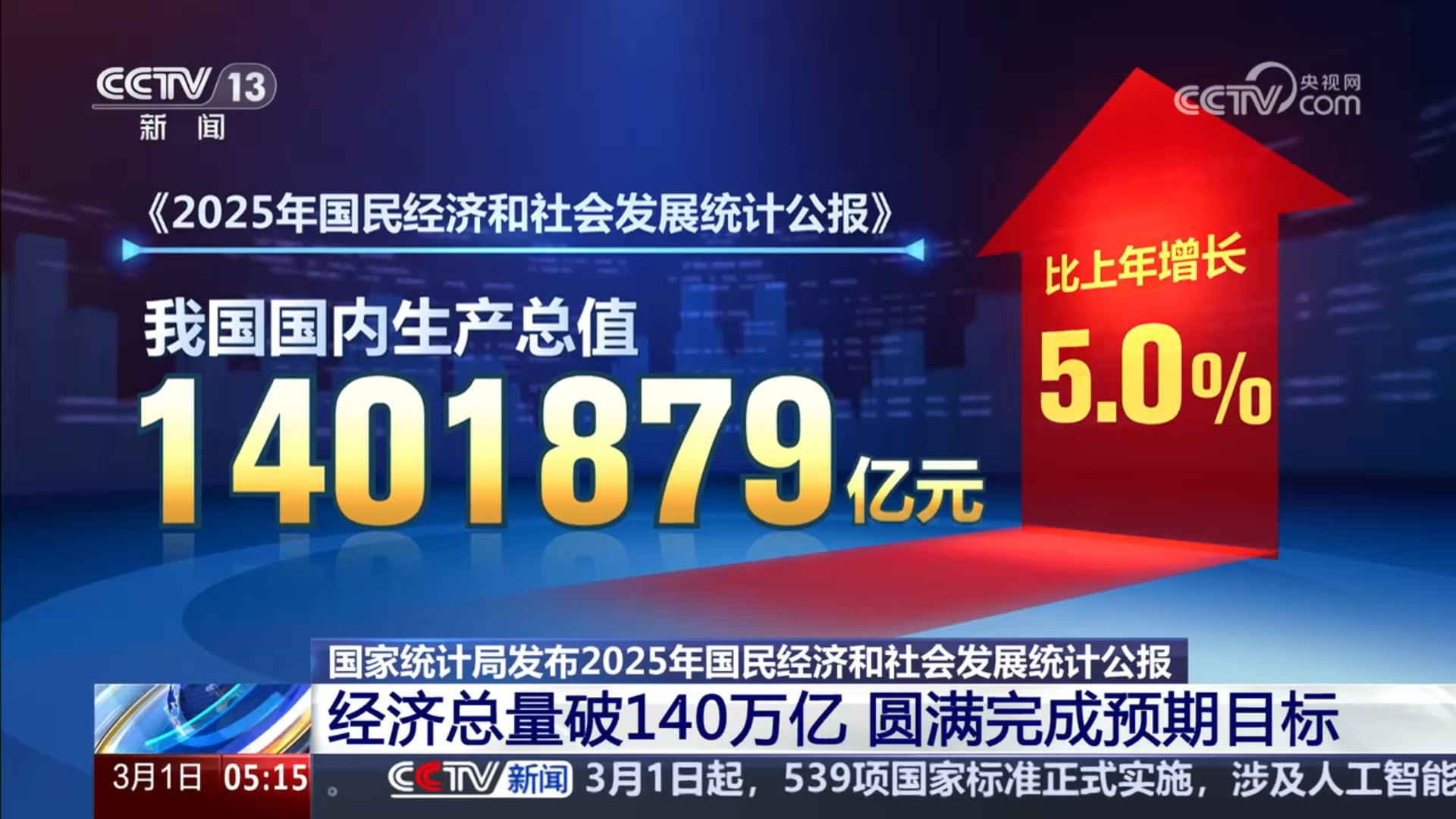 《新闻直播间》国家统计局发布2025年国民经济和社会发展统计公报 经济总量破140万亿 圆满完成预期目标