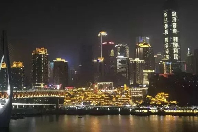 图为重庆网红景点解放碑旁LED屏打出的 “经济普查 利国利民”宣传字幕