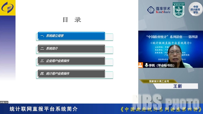 2022年8月20日,中国统计教育学会以在线直播方式举办了“中国政府统计”系列讲座第四讲。国家统计局工业司生产运行处处长王新以“统计联网直报平台系统简介”为题授课,中国统计教育学会副秘书长、成都信息工程大学统计学院院长李勇主持讲座。