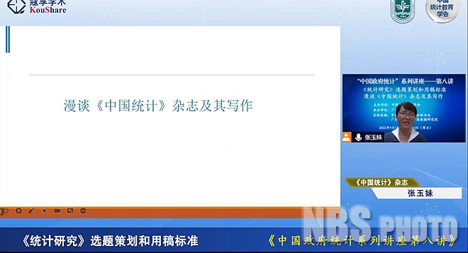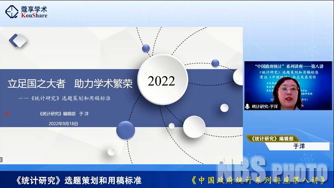 2022年9月18日,中国统计教育学会以在线直播方式举办了“中国政府统计”系列讲座第八讲。《统计研究》编辑部负责人于洋、《中国统计》杂志执行主编张玉妹分别以“立足国之大者 助力学术繁荣——《统计研究》选题策划和用稿标准”和“漫谈《中国统计》杂志及其写作”为题授课,中国统计教育学会副秘书长、首都经济贸易大学数学科学学院副院长阮敬主持讲座。