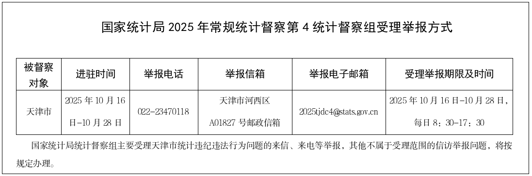 根据党中央和国务院授权,国家统计局2025年常规统计督察第4统计督察组近日进驻天津市开展统计督察,并于10月16日与市委、市政府进行对接沟通。督察组组长、国家统计局党组成员、副局长毛盛勇通报统计督察事宜,提出工作要求。市委书记陈敏尔参加对接沟通并讲话。市委副书记、市长张工参加对接沟通。