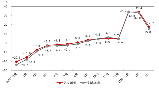市场销售同比增速有所回落。4月份,社会消费品零售总额同比增长17.7%,增速比3月份回落16.5个百分点。月度增速回落主要受同期基数变动、前期部分消费需求在3月份释放等因素影响。从上年基数看,2020年4月份,社会消费品零售总额同比下降7.5%,降幅比3月份收窄8.3个百分点。今年4月份市场销售的基数明显高于3月份,是月度增速回落较大的重要原因。从本年情况看,年初受疫情影响的部分消费需求在3月份释放,导致3月份社会消费品零售总额增速较高。