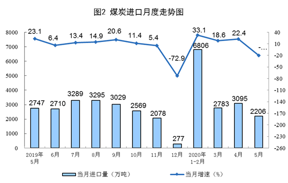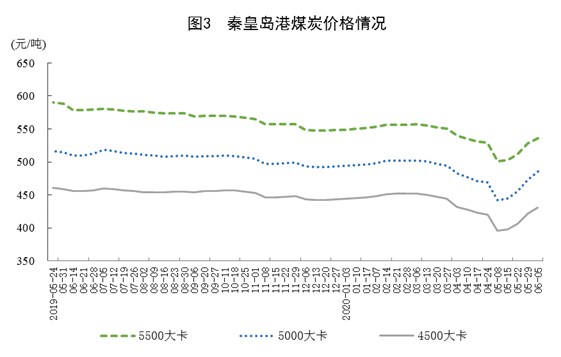 煤炭进口大幅下降,港口交易价格止跌回升。5月份,进口煤炭2206万吨,环比减少889万吨,同比下降19.7%;1—5月份,进口煤炭1.49亿吨,同比增长16.8%。港口煤炭综合交易价格止跌回升,6月5日秦皇岛港5500、5000和4500大卡煤炭价格分别为每吨536元、485元和431元,比5月8日的年内最低点分别回升35元、43元和35元。