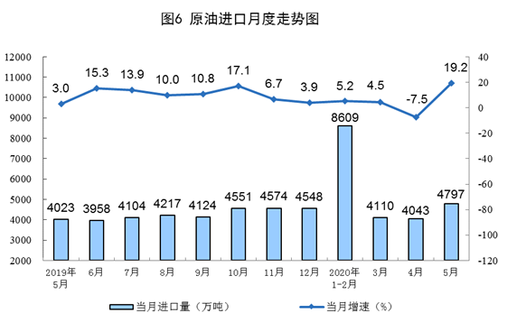 原油进口由降转增,国际原油价格快速回升。5月份,进口原油4797万吨,同比增长19.2%,上月为下降7.5%。1—5月份,进口原油21558万吨,同比增长5.2%。5月29日布伦特原油现货离岸价格为34.15美元/桶,比4月30日的18.11美元/桶回升88.6%。