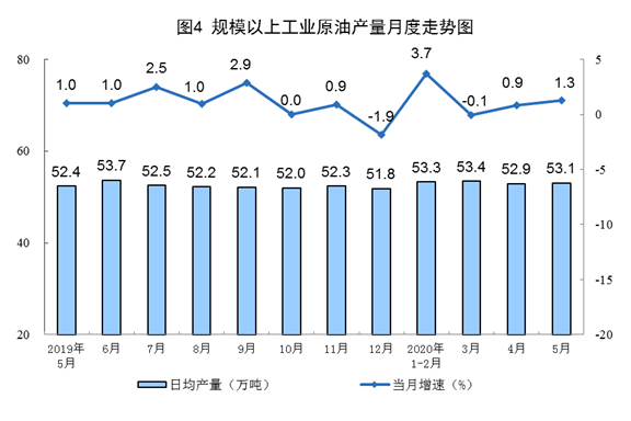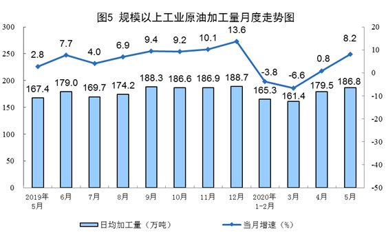 原油生产有所加快,加工量较快增长。5月份,生产原油1646万吨,同比增长1.3%,增速比上月加快0.4个百分点;加工原油5790万吨,增长8.2%,比上月加快7.4个百分点。1—5月份,生产原油8090万吨,同比增长1.9%;加工原油26139万吨,下降1.0%。
