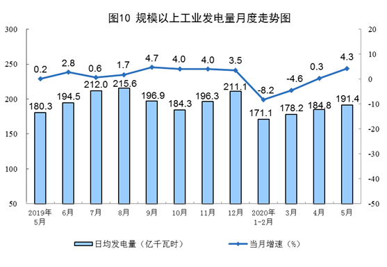 电力生产明显加快。5月份,发电量5932亿千瓦时,同比增长4.3%,比上月加快4.0个百分点,日均发电量191.4亿千瓦时,环比增加6.6亿千瓦时。1—5月份,发电量27325亿千瓦时,同比下降3.1%。