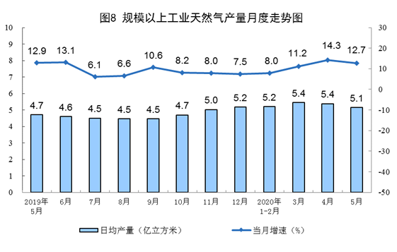天然气生产保持较快增长。5月份,生产天然气159亿立方米,同比增长12.7%,增速比上月回落1.6个百分点,日均产量5.1亿立方米。1—5月份,生产天然气788亿立方米,同比增长10.1%。