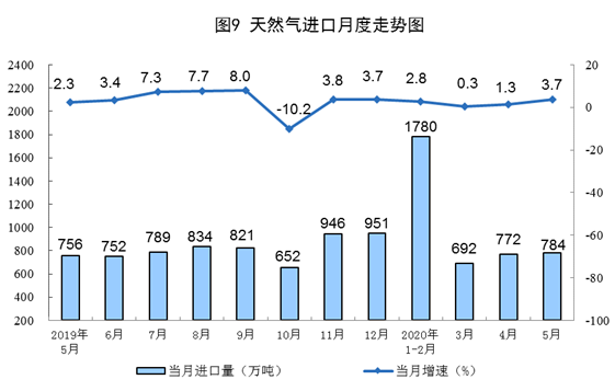 天然气进口稳定增长。5月份,进口天然气784万吨,同比增长3.7%。1—5月份,进口天然气4012万吨,同比增长1.9%。