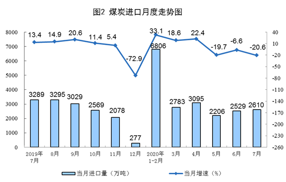 煤炭进口下降。7月份,进口煤炭2610万吨,环比增加81万吨,同比下降20.6%,降幅比上月扩大14.0个百分点;1—7月份,进口煤炭2.0亿吨,同比增长6.8%。
