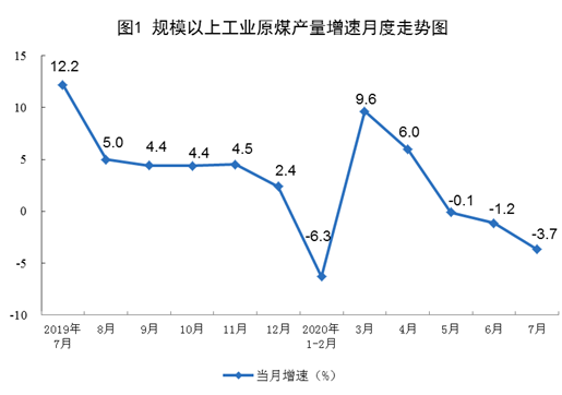 原煤生产降幅扩大。7月份,生产原煤3.2亿吨,同比下降3.7%,降幅比上月扩大2.5个百分点;日均产量1026万吨,环比减少88万吨。1—7月份,生产原煤21.2亿吨,同比下降0.1%。