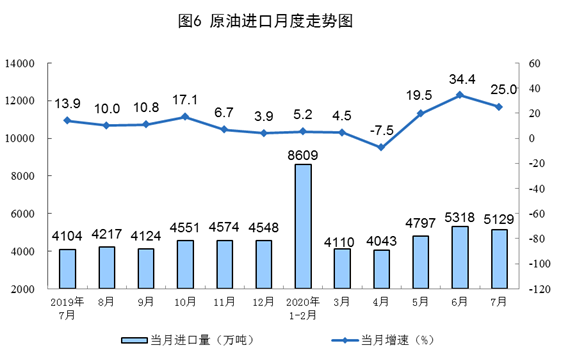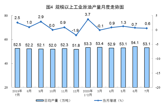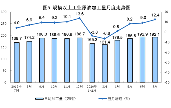 原油生产基本持平,加工量快速增长。7月份,生产原油1646万吨,同比增长0.6%,增速比上月回落0.1个百分点;加工原油5956万吨,增长12.4%,比上月加快3.4个百分点。1—7月份,生产原油11350万吨,同比增长1.4%;加工原油3.8亿吨,同比增长2.3%。