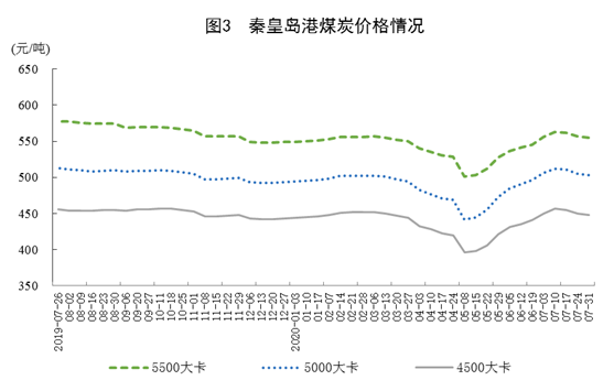 港口煤炭综合交易价格先涨后跌。7月31日,秦皇岛港5500大卡、5000大卡和4500大卡煤炭价格分别为每吨555元、503元和448元,比7月10日的年内最高价下跌8元、9元和9元,比7月3日下跌1元、3元和2元。