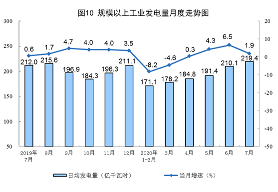 电力生产增速放缓。7月份,发电量6801亿千瓦时,同比增长1.9%,增速比上月回落4.6个百分点;日均发电量219.4亿千瓦时,环比增加9.3亿千瓦时。1—7月份,发电量40451亿千瓦时,同比下降0.9%。