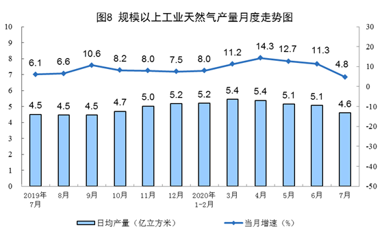 7月份,规模以上工业原煤生产降幅扩大,原油生产基本持平,天然气、电力生产增速放缓。