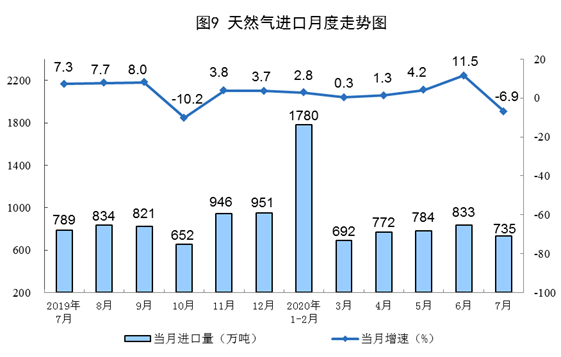 天然气进口由增转降。7月份,进口天然气735万吨,同比下降6.9%,上月为增长11.5%。1—7月份,进口天然气5571万吨,同比增长1.9%。