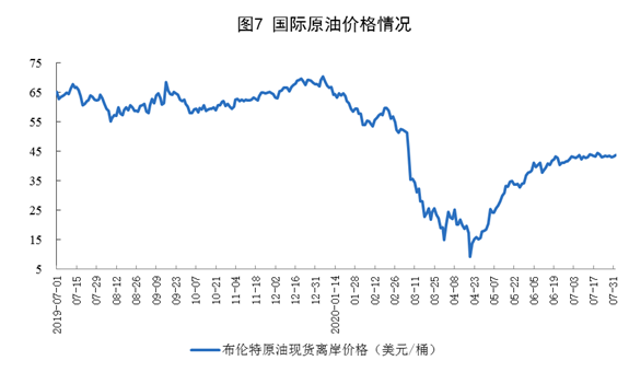 原油进口快速增长,国际原油价格震荡回升。7月份,进口原油5129万吨,同比增长25.0%。1—7月份,进口原油3.2亿吨,同比增长12.1%。7月31日布伦特原油现货离岸价格为43.13美元/桶,比6月30日的41.64美元/桶回升3.6%。