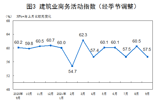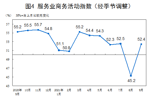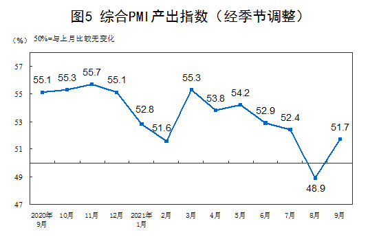 9月份,综合PMI产出指数为51.7%,比上月上升2.8个百分点,表明我国企业生产经营活动总体较上月有所加快。