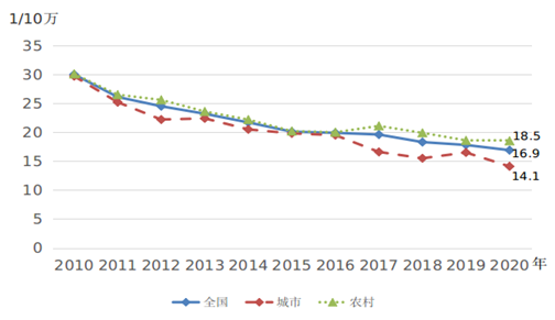 2.孕产妇死亡率下降超四成。《纲要》实施以来,我国在全力保障母婴安全基础上,积极推进妇幼健康全程服务,孕产妇死亡率持续下降,妇幼健康水平显著提升。2020年,我国孕产妇死亡率为16.9/10万,比2010年降低43.7%,指标水平居全球中高收入国家前列。城市与农村孕产妇死亡率分别为14.1/10万和18.5/10万,分别比2010年降低52.5%和38.5%(见图1)。