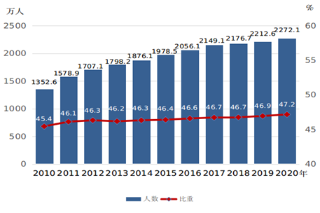 2.女性参加医疗保险的人数大幅增加。近年来,我国在城乡妇女基本医疗保障实现制度全覆盖的基础上,通过整合城乡居民医疗保险,完善城乡医疗救助和补充医疗保险制度,进一步完善多层次医疗保障体系,使更多女性享有更公平的医疗保障。2020年末,全国女性参加基本医疗保险的人数为6.5亿人,是2011年末[10]的3.4倍;其中,参加职工基本医疗保险的人数为1.6亿人,比2010年末增加5801.8万人,增长55.1%;参加城乡居民基本医疗保险的人数为4.9亿人,比2011年末增加4.1亿人,是2011年末的6.5倍。