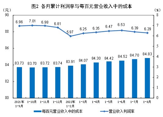 1—8月份,规模以上工业企业每百元营业收入中的成本为84.83元,同比增加1.04元;每百元营业收入中的费用为7.91元,同比减少0.51元。