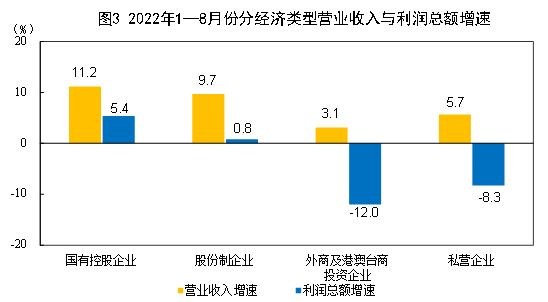 1—8月份,规模以上工业企业中,国有控股企业实现利润总额19011.0亿元,同比增长5.4%;股份制企业实现利润总额40623.6亿元,增长0.8%;外商及港澳台商投资企业实现利润总额12797.0亿元,下降12.0%;私营企业实现利润总额14955.5亿元,下降8.3%。