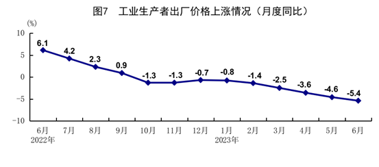 上半年,全国工业生产者出厂价格同比下降3.1%。其中,6月份同比下降5.4%,环比下降0.8%。上半年,工业生产者购进价格同比下降3.0%。其中,6月份同比下降6.5%,环比下降1.1%。