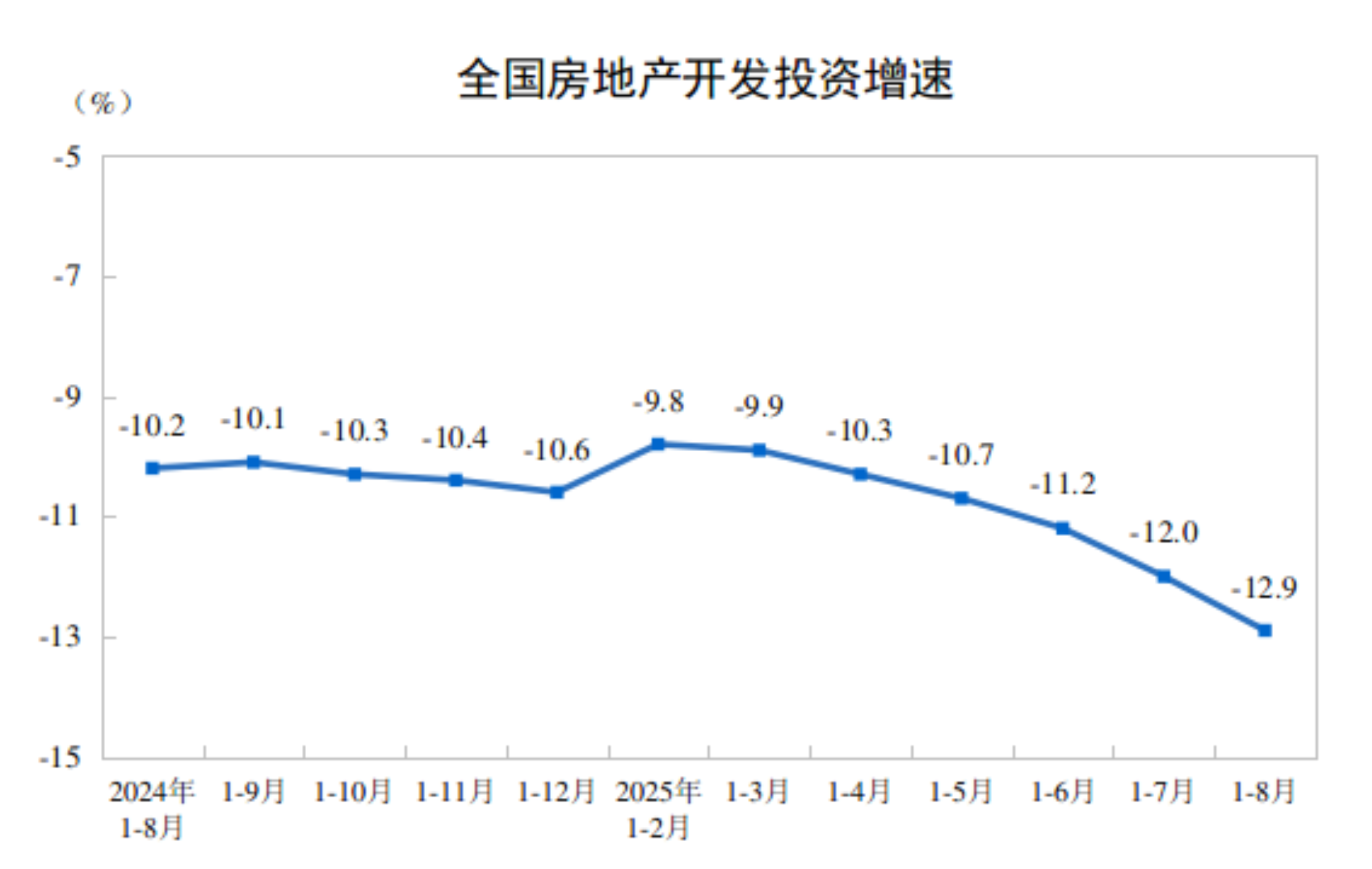 1—8月份,全国房地产开发投资60309亿元,同比下降12.9%(按可比口径计算,详见附注6);其中,住宅投资46382亿元,下降11.9%。