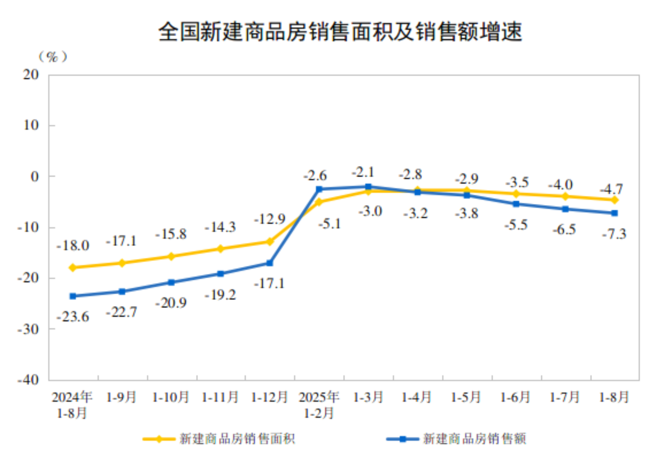 1—8月份,房地产开发企业房屋施工面积643109万平方米,同比下降9.3%。其中,住宅施工面积448460万平方米,下降9.6%。房屋新开工面积39801万平方米,下降19.5%。其中,住宅新开工面积29304万平方米,下降18.3%。房屋竣工面积27694万平方米,下降17.0%。其中,住宅竣工面积19876万平方米,下降18.5%。