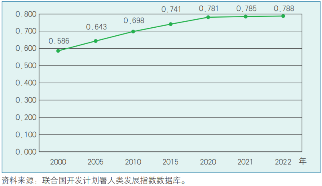 如图1,中国人类发展指数从2000年的0.586提升至2022年的0.788,由2000年的116位上升至2022年的75位,从中等人类发展水平跨入高人类发展水平。