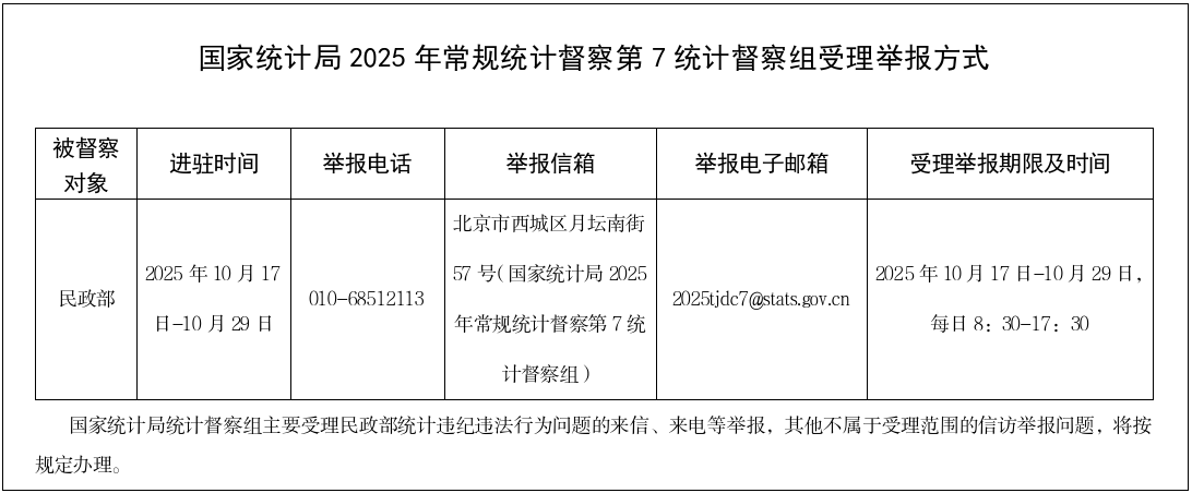 根据党中央和国务院授权,国家统计局2025年常规统计督察第7统计督察组近日进驻民政部开展统计督察,并于10月17日与民政部进行对接沟通。督察组组长、国家统计局党组书记、局长康义通报统计督察事宜,提出工作要求。民政部党组书记、部长陆治原主持对接沟通并讲话。