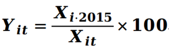 第一步:使用以2015年基期数值为100的方法,对三级指标进行标准化处理,得到个体指数。具体处理方法如下: